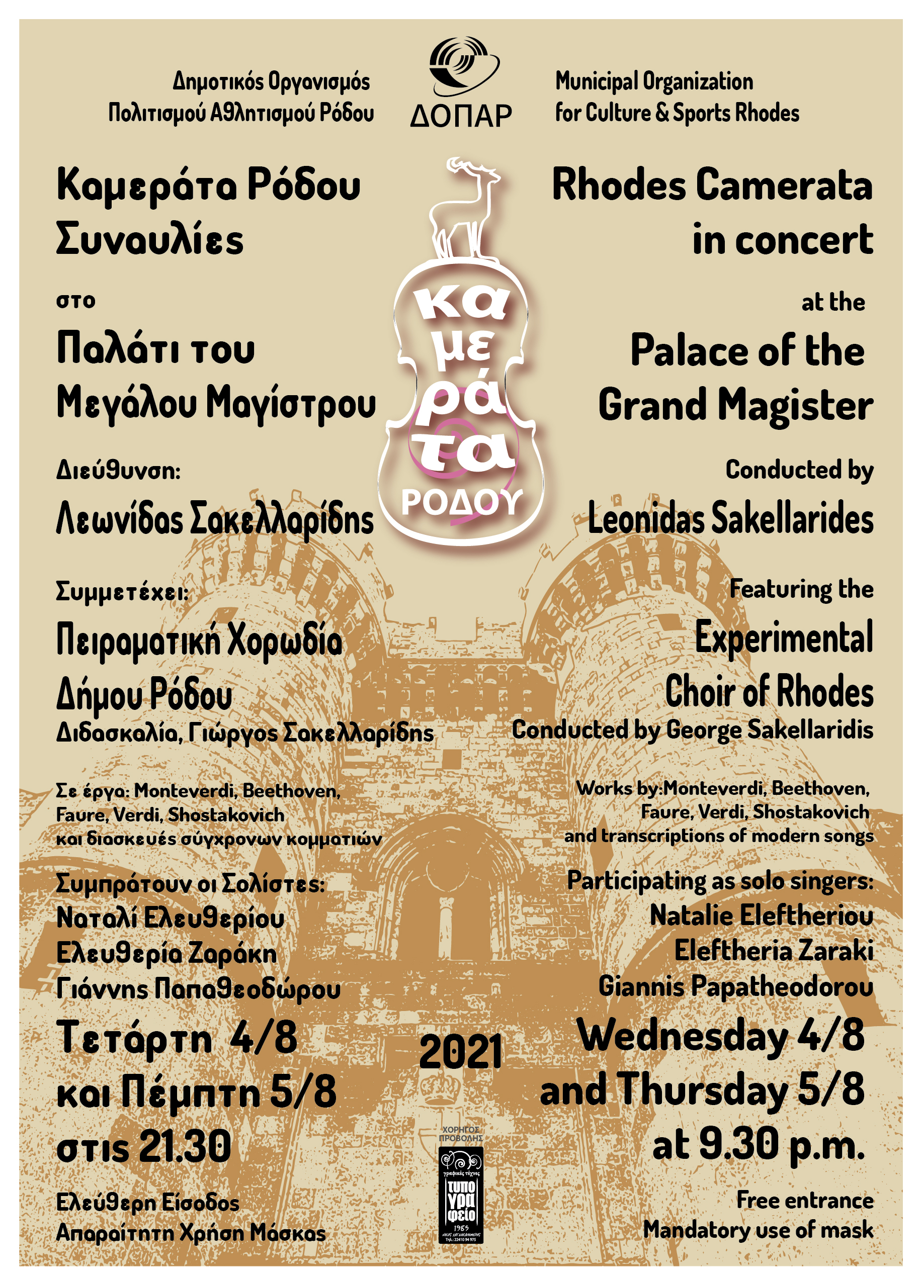 Rhodes Municipal Organization of Culture and sports organizes two concerts with RHODES CAMERATA ORCHESTRA, directed by Leonidas Sakellarides, on Wednesday 4th of August and Thursday 5th of August 2021 at the Palace of the Grand Magister in the old town of Rhodes. The 33 member Chamber Symphonic Orchestra will perform works by Monteverdi, Verdi, Faure, Beethoven, Shostakovich, as well as adaptations of modern songs, featuring a live on stage Rock band. Rhodes Camerata will be collaborating with the Experimental Choir of Rhodes (directed by George Sakellaridis) for these concerts. Also participating, the Rhodian singer soloists: Natalie Efthymiou, Eleftheria Zaraki and GIannis Papatheodorou. The concerts will begin at 9.30 p.m. The use of mask in mandatory. Free entrence. We wish to thank the Ephorate of Antiquities of Dodecanese for allowing the use of the Palace as the concert venue.