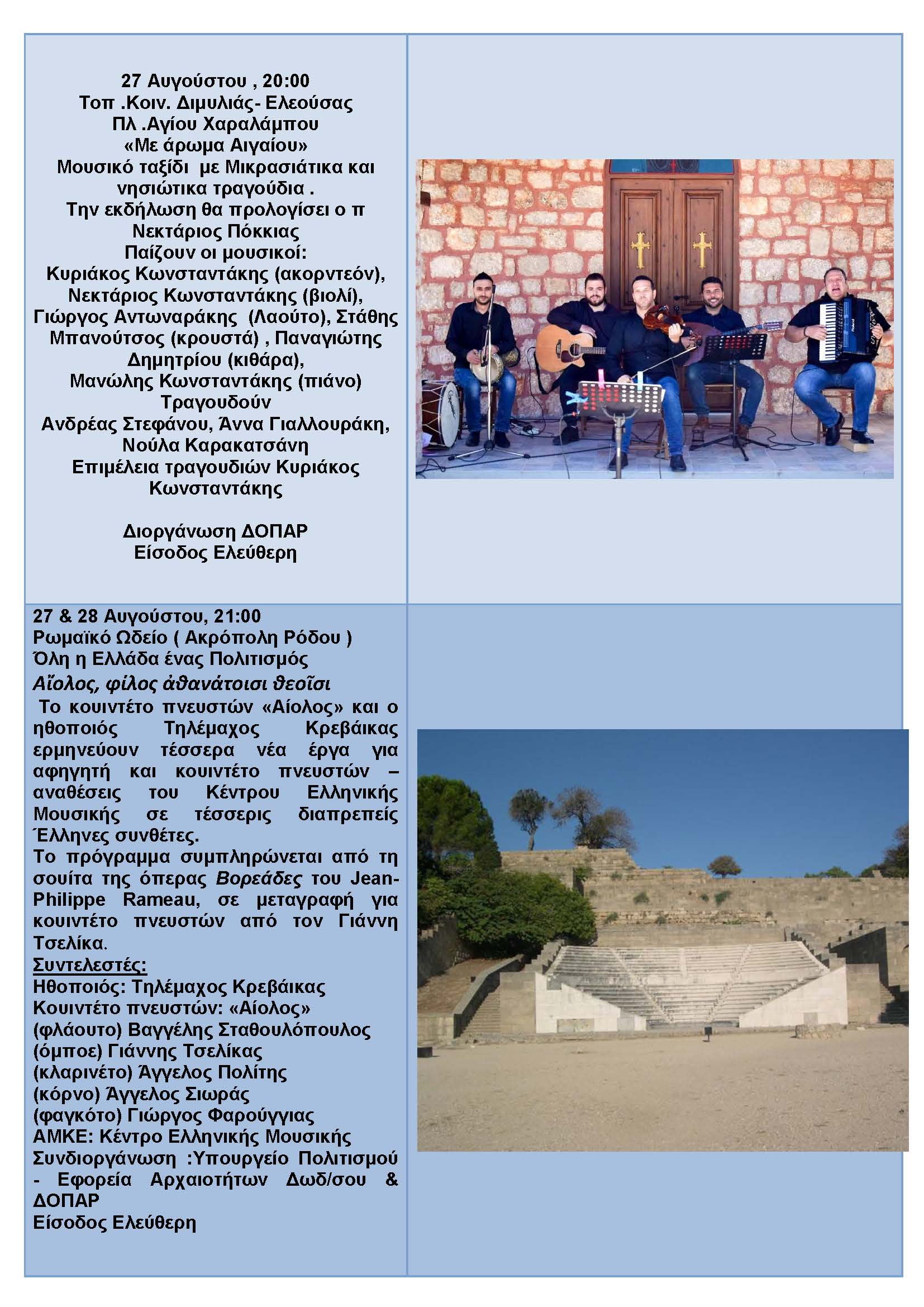 Το πρόγραμμα συμπληρώνεται από τη σουίτα της όπερας Βορεάδες του 3~7-ΡhίΙίρρθ Rameau, σε μεταγραφή για κουιντέτο πνευστών από τον Γιάννη Τσελίκα. Συντελεστές: Ηθοποιός: Τηλέμαχος Κρεβάικας Κουιντέτο πνευστών: «Αίολος» {φλάουτο} Βαγγέλης Σταθουλόπουλος (όμποε) Γιάννης Τσελίκας (κλαρινέτο) Άγγελος Πολίτης (κόρνο) Αγγελος Σιωράς (φαγκότο) Γιώργος Φαρούγγιας ΑΜΚΕ: Κέντρο Ελληνικής Μουσικής Συνδιοργάνωση :Υπουργείο Πολιτισμού – Εφορεία Αρχαιοτήτων Δωδ1σου & ΔΟΠΑΡ Είσοδος Ελεύθερη