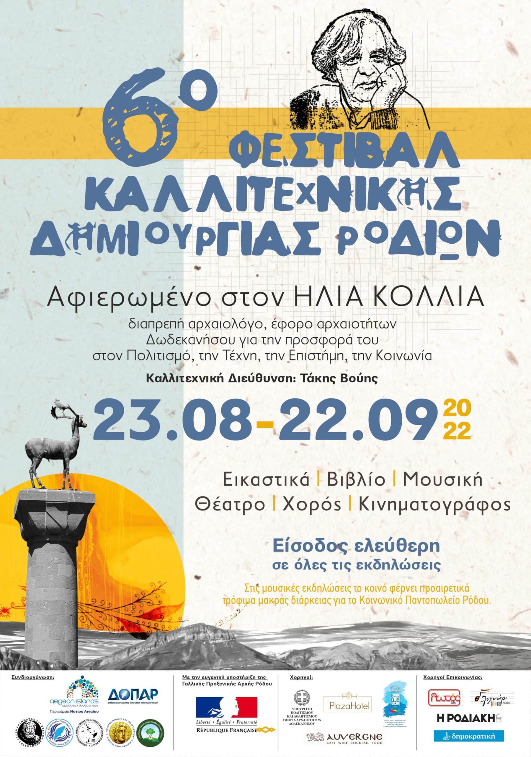 Κυριακή 4/9/2022: Βραδιά αφιερωμένη στο τιμώμενο πρόσωπο του 6ου Φεστιβάλ αρχαιολόγο Ηλία Κόλλια. Προβολή βίντεο για την ζωή και το έργο του. Ομιλητές: ο κος Γιώργος Γιαννόπουλος αρχιτέκτονας πρ. Δήμαρχος Ρόδου, η κα Ελένη Παπαβασιλείου, αρχαιολόγος και η κα Κατερίνα Μανούσου – Ντέλλα αρχιτέκτονας. Παλάτι των Ιπποτών – Ωρα έναρξης 21:00