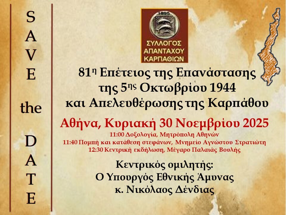 SAVE the DATE-Παγκαρπαθιακός Εορτασμός 81ης Επετείου Επανάστασης της 5ης Οκτ.1944 και Απελευθέρωσης της Καρπάθου